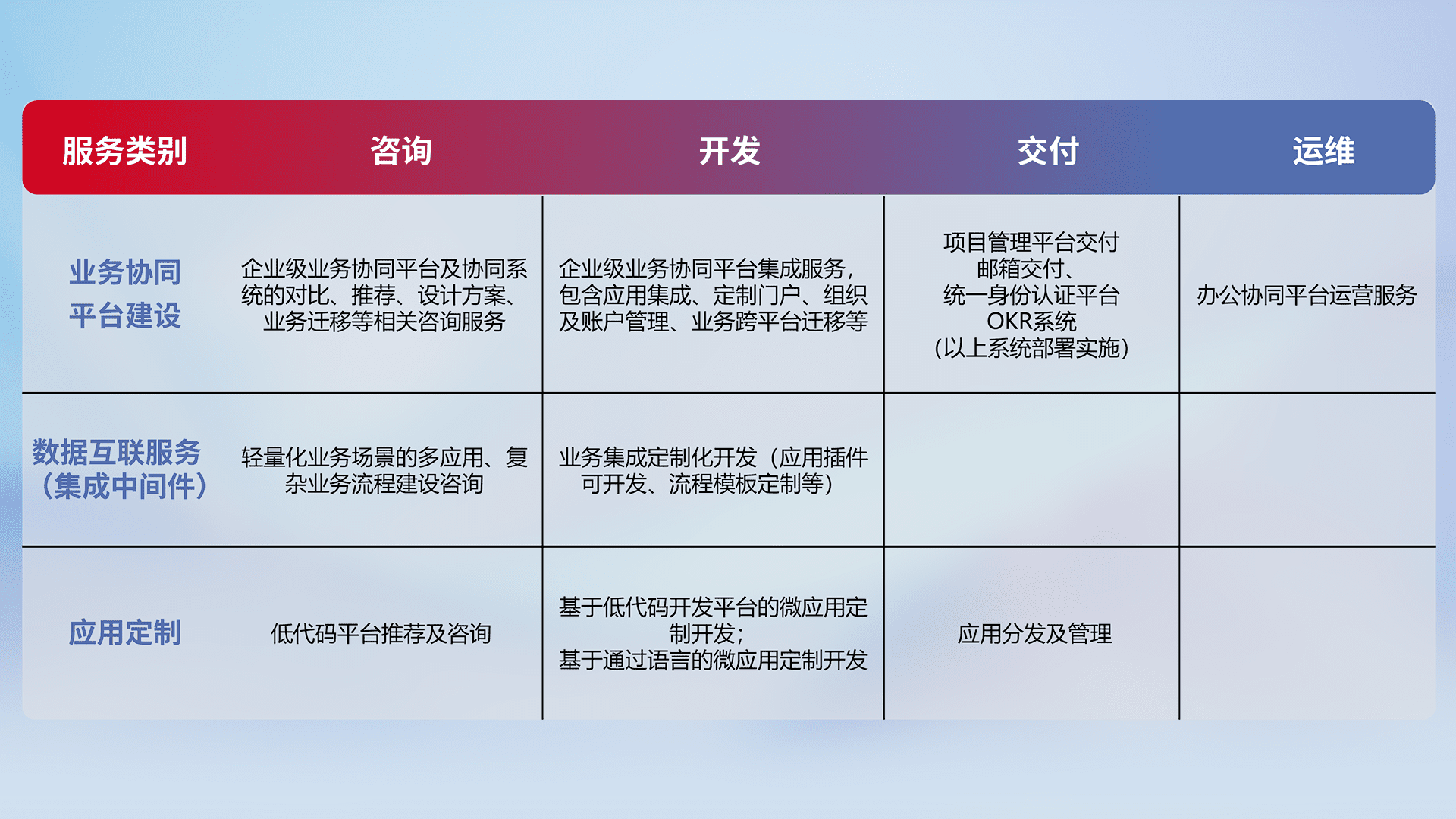针对钉钉、、企微、、、IDaas等平台级产品提供产品的规划、、、、方案、、、交付、、、定制化开发等服务,,,,实现如统一协同办公、、、智能客户服务、、、、混合会议管理、、智能数据查询、、、、等业务场景,,,实现数字化转型。。